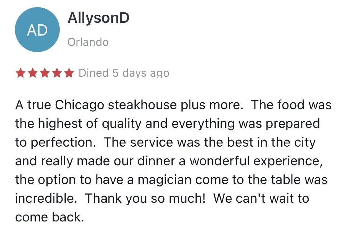 Dine at Chicago’s Premier Steakhouse, SWIFT & SONS STEAK HOUSE with a modern twist. As you step inside this West Loop (1000 W Fulton Market) building, you will experience the feeling of walking into a luxury, old boys' club—turn of the 20th century office building with high ceilings, stained glass lighting, and mosaic marble floors. Raw concrete columns and mushroom capitals are left exposed, providing peeks to the original architecture of the building. After dinner, witness a truly unique table side magic presentation. Ask you Captain or book a request when you make the reservation. Magic is available Tuesday-Saturday.